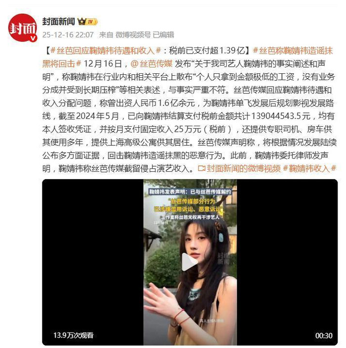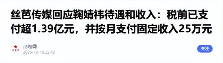 丝芭传媒经心罪状,曝光鞠婧祎1.39亿税前收入,控诉她老是报销私东谈主开销,公司都给了,还给她安排外滩豪宅和房车等,依然穷力尽心。