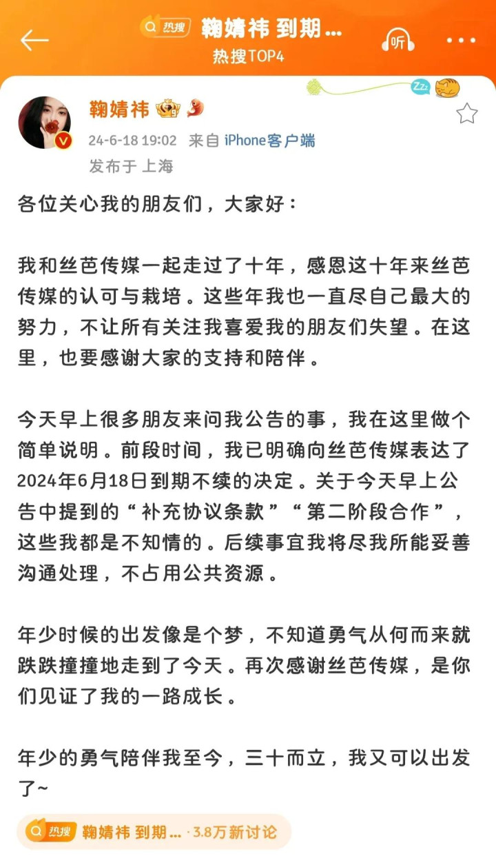 两边的中枢争执在于,鞠婧祎合约到期后,到底续约了没?