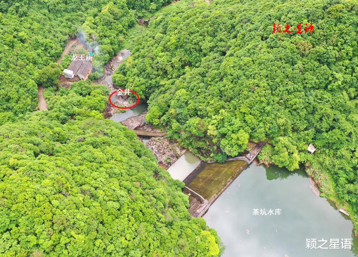 从茶坑水库大坝下龙王庙傍边的小径走到溪边,往大坝标的走,不测发现自然的金井就在水潭边,不禁惊可爱跃,振臂愉快:找到金井啦!终于找到金井啦!